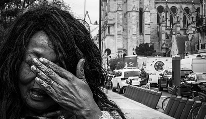 Στην ασπρόμαυρη, συγκλονιστική φωτογραφία του βλέπουμε μία γυναίκα μερικά μέτρα μακριά από τον Καθεδρικό Ναό της Παναγίας των Παρισίων την επόμενη μέρα της φωτιάς, η οποία θρηνεί για την καταστροφή του μνημείου και κρατάει με το χέρι της το λυπημένο και απεγνωσμένο πρόσωπό της.