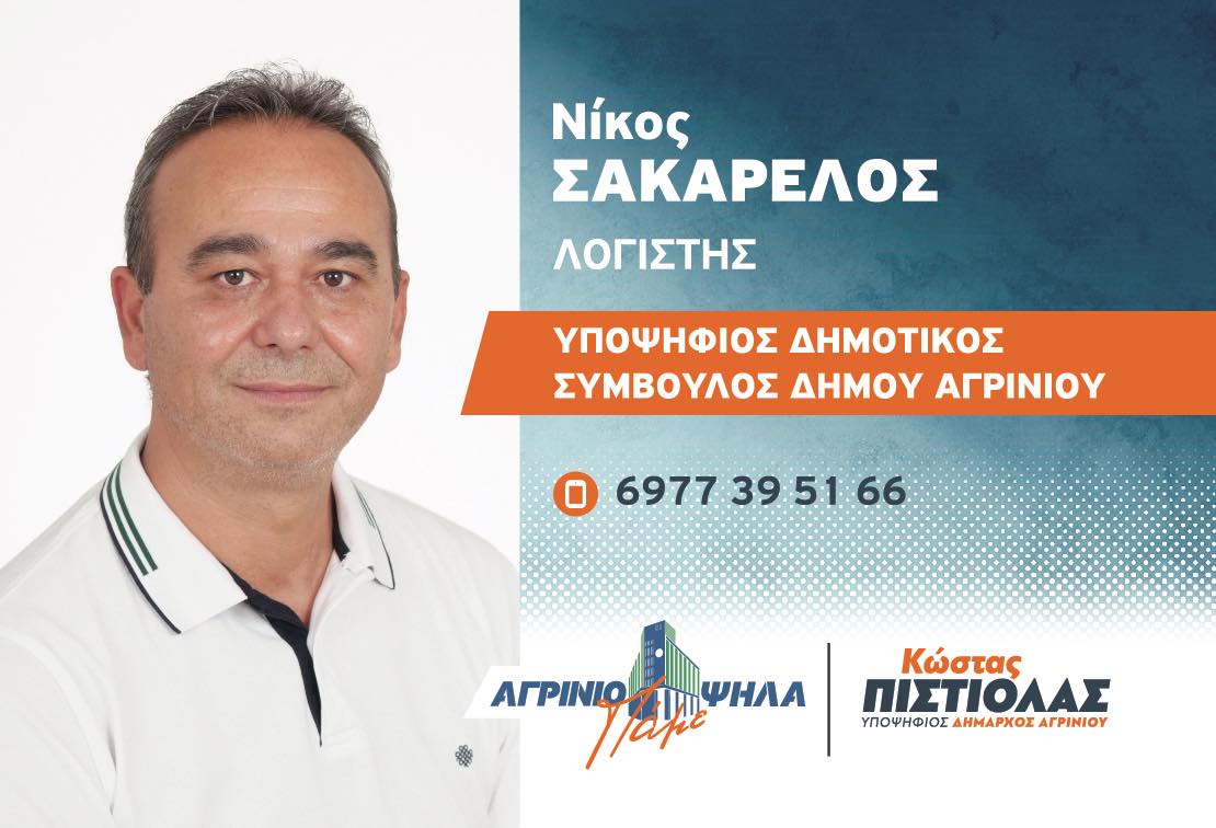 Αποτελεί αναμφισβήτητα μία σημαντική και αξιοπρόσεκτη υποψηφιότητα στο ψηφοδέλτιο της Παράταξης «Αγρίνιο, Πάμε Ψηλά» του Κώστα Πιστιόλα η υποψηφιότητα του Νίκου Σακαρέλου, ανθρώπου με μεγάλη προσφορά τόσο στην κοινωνία, όσο και στην πολιτική μιας και ο Νίκος Σακαρέλος διετέλεσε, εκτός των άλλων, επί πολλά χρόνια Γραμματέας της Τοπικής Οργάνωσης του ΠΑ.ΣΟ.Κ. Νεάπολης του Δήμου Αγρινίου.