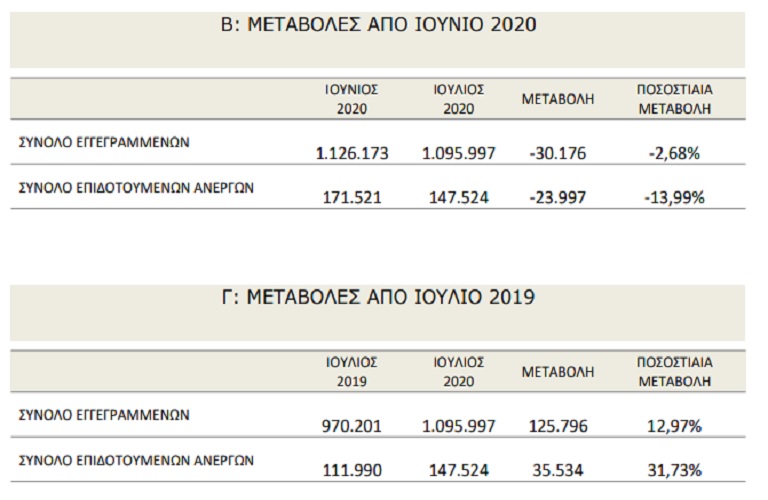 Το σύνολο των εγγεγραμμένων ανέργων, με κριτήριο την αναζήτηση εργασίας (αναζητούντων εργασία), για τον μήνα Ιούλιο 2020, ανήλθε σε 1.040.852 άτομα.
