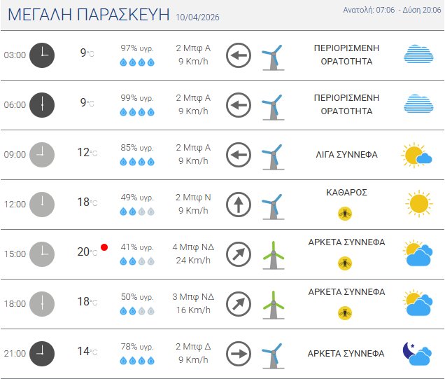 Πιο αναλυτικά, τη Μεγάλη Παρασκευή, 10 Απριλίου 2026 αναμένονται τοπικές νεφώσεις παροδικά πιο αυξημένες με τοπικές βροχές κυρίως στα βορειοανατολικά και πιθανώς στα ανατολικά ηπειρωτικά. Τοπικές χιονοπτώσεις αναμένονται στα βορειοανατολικά ορεινά πάνω από τα 1200 μέτρα.