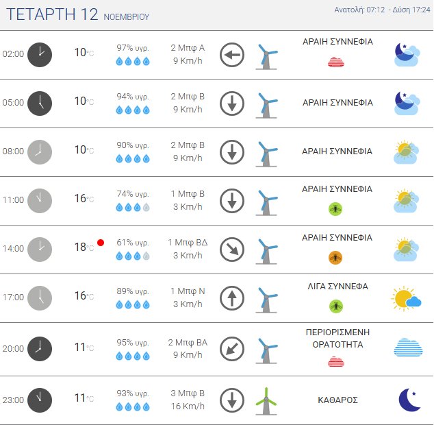 Για την Τετάρτη, 12 Νοεμβρίου 2025 προβλέπονται λίγες νεφώσεις κατά διαστήματα αυξημένες στα Ανατολικά και Νότια, με τοπικές βροχές σε Σποράδες, Εύβοια και πιθανόν σε Κεντρική Μακεδονία και Ανατολική Θεσσαλία και μετά το μεσημέρι σε Κυκλάδες, Κρήτη και πιθανόν Ανατολική Στερεά.