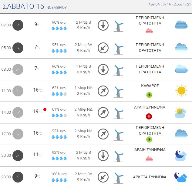 Ηλιοφάνεια στις περισσότερες περιοχές, με κατά τόπους περιορισμένη ορατότητα τις πρωινές και βραδινές ώρες, ισχυροί βόρειοι άνεμοι στις Νότιες Κυκλάδες και τα Δωδεκάνησα, αμετάβλητη θερμοκρασία.