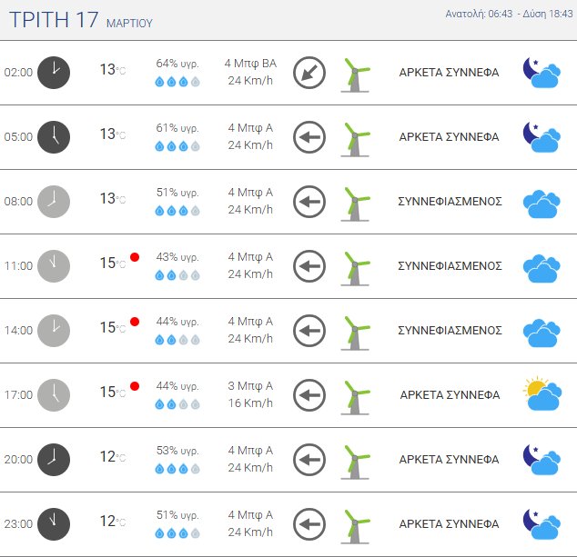 Την Τρίτη, 17 Μαρτίου 2026 αναμένονται νεφώσεις ενώ βροχές θα εκδηλωθούν σε σημαντικό τμήμα της χώρας. Κανονικές για την εποχή θερμοκρασίες. Άνεμοι έως 6 μποφόρ στα πελάγη.
