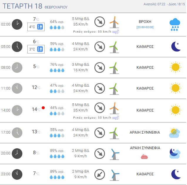 Για την Τετάρτη, 18 Φεβρουαρίου 2026 προβλέπεται ηλιοφάνεια με λίγες νεφώσεις, αυξημένες στα ανατολικά τμήματα, με τοπικές βροχές σε Θράκη και πρόσκαιρες καταιγίδες σε νησιά Ανατολικού Αιγαίου, Δωδεκάνησα και Κρήτη, με γρήγορη βελτίωση. Πιθανότητα τοπικών βροχών στα δυτικά τμήματα της Πελοποννήσου τις πρωινές ώρες, ενώ χιονοπτώσεις προβλέπονται στα ορεινά της Θράκης.