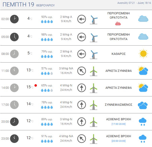 Για την Πέμπτη, 19 Φεβρουαρίου 2026 προβλέπεται ηλιοφάνεια με λίγες νεφώσεις, πυκνότερες στα Δυτικά Τμήματα, με τοπικές βροχές μετά το μεσημέρι σε Ήπειρο, Ιόνιο και Δυτική Στερεά, που τις βραδινές ώρες στο Βόρειο Ιόνιο θα ενταθούν και θα εκδηλωθούν και καταιγίδες.