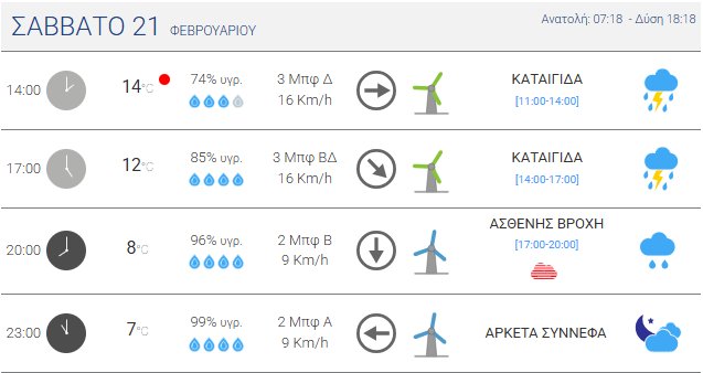 Σύμφωνα με το meteo.gr αναμένεται να εκδηλωθούν καταιγίδες τις μεσημεριανές αλλά και απογευματινές ώρες ενώ γύρω στις 20:00 μόνο ασθενείς βροχοπτώσεις.