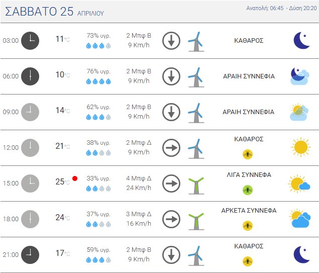Το Σάββατο, 25 Απριλίου 2026 αναμένονται τοπικές βροχές στην Κρήτη και στα Δωδεκάνησα και γενικά αίθριος καιρός στην υπόλοιπη χώρα. Φυσιολογικές για την εποχή θερμοκρασίες με εξαίρεση την Κρήτη και τα Δωδεκάνησα όπου θα είναι σχετικά χαμηλές. Άνεμοι έως 5 μποφόρ στο Αιγαίο.
