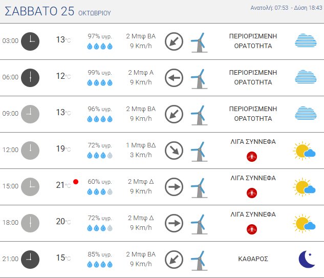 Το Σάββατο, 25 Οκτωβρίου 2025 αναμένονται λίγα τοπικά φαινόμενα. Τοπικά υψηλές θερμοκρασίες σε ηπειρωτικά και Κρήτη. Άνεμοι έως 5 μποφόρ στο Αιγαίο.