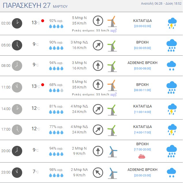 Βροχές ή καταιγίδες στις περισσότερες περιοχές της χώρας. Χιόνια στα ηπειρωτικά ορεινά και σε ημιορεινά τμήματα της Δυτικής Μακεδονίας και της Ηπείρου. Πολύ ενισχυμένοι άνεμοι στα πελάγη. Πτώση της θερμοκρασίας. Αυξημένες συγκεντρώσεις σκόνης σε Κρήτη και Δωδεκάνησα.