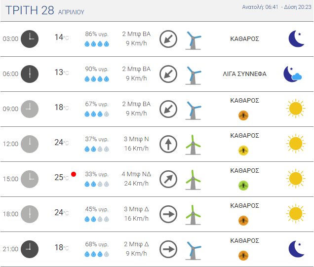Για την Τρίτη, 28 Απριλίου 2026 προβλέπεται ηλιοφάνεια με λίγες νεφώσεις, αυξημένες τις θερμές ώρες της ημέρας με τοπικούς όμβρους ή μεμονωμένες καταιγίδες στα ορεινά της Μακεδονίας, της Ηπείρου, της Κεντρικής Στερεάς και πιθανόν της Πελοποννήσου. Η ορατότητα θα είναι κατά τόπους περιορισμένη κυρίως στα κεντρικά και δυτικά ηπειρωτικά τις βραδινές και πρώτες πρωινές ώρες.