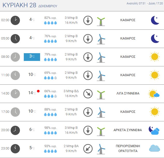 Για την Κυριακή, 28 Δεκεμβρίου 2025 προβλέπεται ηλιοφάνεια με λίγες νεφώσεις, αυξημένες στα Ανατολικά και Νότια Τμήματα, με τοπικές βροχές σε Νησιά Ανατολικού Αιγαίου, Νότια και Δυτική Πελοπόννησο, Νότιο Ιόνιο, στα Βόρεια και Ορεινά Τμήματα της Κρήτης και πιθανόν στις Κυκλάδες.