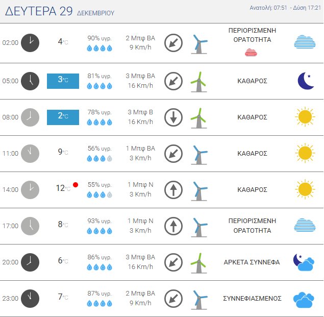 Για τη Δευτέρα, 29 Δεκεμβρίου 2025 προβλέπεται ηλιοφάνεια με λίγες νεφώσεις, αυξημένες στα ανατολικά και νότια τμήματα, με πιθανότητα τοπικών βροχών σε Σποράδες, Νότια Πελοπόννησο, στα βόρεια και ορεινά τμήματα της Κρήτης και πιθανόν στις Κυκλάδες.