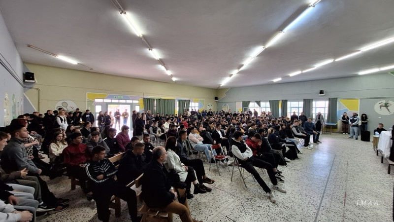 Αρχικά ξεναγήθηκε στις αίθουσες και συνομίλησε με τους εκπαιδευτικούς και στη συνέχεια στην αίθουσα εκδηλώσεων του Σχολείου συνομίλησε με τους μαθητές σε πολλή ζεστή και όμορφη ατμόσφαιρα.