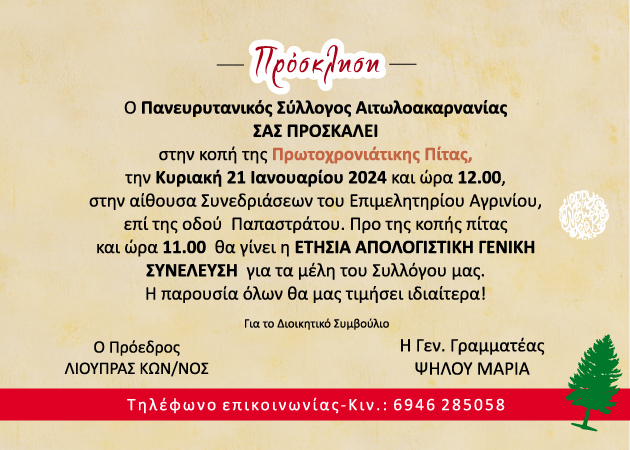 Κόβει την Πρωτοχρονιάτικη πίτα του ο Πανευρυτανικός Σύλλογος Αιτωλοακαρνανίας την Κυριακή, 21 Ιανουαρίου 2024 και ώρα 12:00 στην αίθουσα συνεδριάσεων του Επιμελητηρίου στο Αγρίνιο.