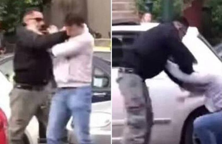 Τότε, ο οδηγός του οχήματος, με τη γκρι ζακέτα, βγαίνει από το αυτοκίνητο και πιάνεται στα χέρια με τον άνδρα που τον απειλούσε και του κλωτσούσε το αυτοκίνητο.