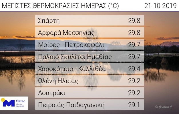 Υψηλές για την εποχή θερμοκρασίες καταγράφηκαν και τη Δευτέρα 21 Οκτωβρίου 2019. Η θερμοκρασία πλησίασε τους 30 βαθμούς σε πολλές ηπειρωτικές περιοχές, αλλά και στη Νότια Κρήτη. Στον πίνακα που ακολουθεί παρουσιάζονται οι 8 σταθμοί στου δικτύου αυτόματων μετεωρολογικών σταθμών του Εθνικού Αστεροσκοπείου Αθηνών / meteo.gr που κατέγραψαν τις υψηλότερες μέγιστες θερμοκρασίες. Όπως χαρακτηριστικά φαίνεται τσε αυτόν η θερμοκρασία ξεπέρασε τους 29.5 βαθμούς στη Σπάρτη, στα Αρφαρά Μεσσηνίας, στις Μοίρες Πετροκεφαλίου και στο Παλαιό Σκυλίτσι Ημαθίας.