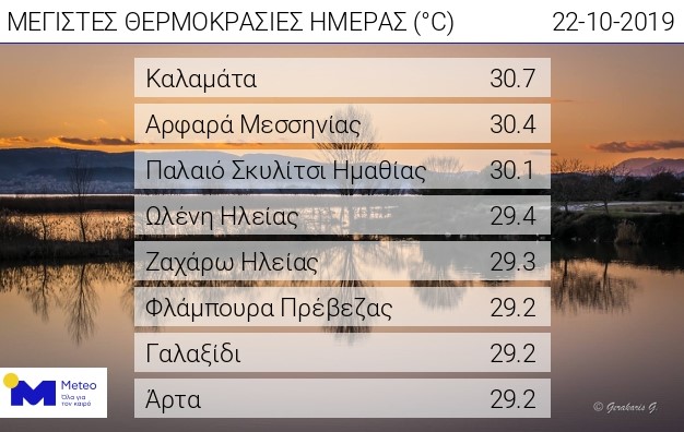 Υψηλές για την εποχή θερμοκρασίες καταγράφηκαν το μεσημέρι της Τρίτης 22 Οκτωβρίου 2019 στα ηπειρωτικά, με το θερμόμετρο να πλησιάζει τους 31 βαθμούς Κελσίου στους σταθμούς της Καλαμάτας (30.7) και των Αρφαρών Μεσσηνίας (30.4).