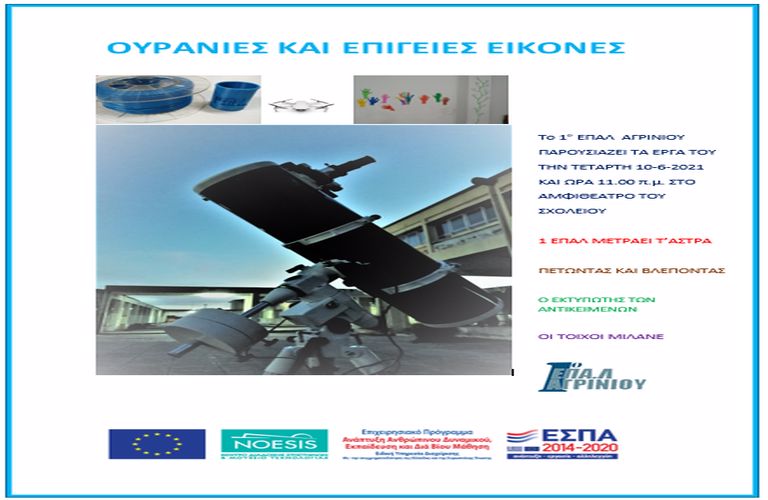 Τη φετινή χρονιά επιλέξαμε να προσεγγίσουμε τεχνολογίες αιχμής, να δώσουμε προοπτικές, να ταξιδέψουμε ψηλά και μακριά, να επιτρέψουμε στους μαθητές μας να εκφραστούν μέσα από τη συμμετοχή τους (δια ζώσης ή εξ αποστάσεως) στις δράσεις μας ολοκληρώνοντας έτσι ένα ταξίδι στον ψηφιακό, στον ανθρωπογενή αλλά και τον φυσικό κόσμο.