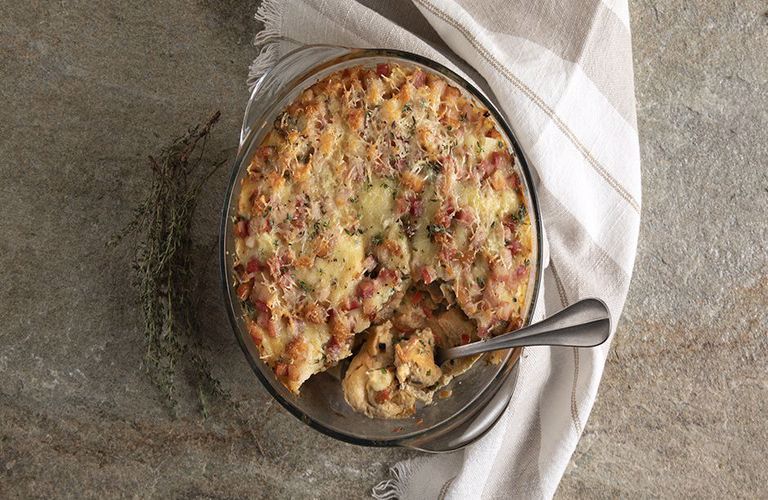 Απλώνουμε τα κυβάκια του ζαμπόν πάνω από τα λαχανικά και πασπαλίζουμε με τα 200 γρ. τριμμένης γραβιέρας.