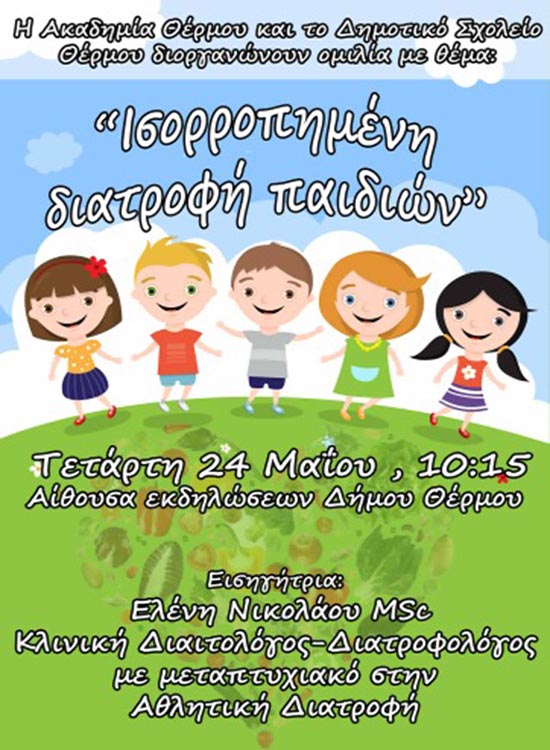 Η Ακαδημία Θέρμου και το Δημοτικό Σχολείο Θέρμου διοργανώνουν ομιλία με θέμα την “Ισορροπημένη διατροφή παιδιών”, την Τετάρτη 24 Μαΐου και ώρα 10:15 το πρωί στην αίθουσα εκδηλώσεων του δήμου Θέρμου.