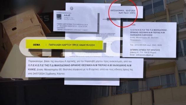 Στο σχετικό έγγραφο που εξασφάλισε αποκλειστικά το Μega και φέρει το σήμα της Α.Α.Δ.Ε. αναγράφεται η φράση «παραλαβή χάρτου προς ανακύκλωση», έχει ημερομηνία 2 Ιουλίου 2025, και κοινοποιείται στον Ο.Π.Ε.Κ.Ε.Π.Ε. της Περιφερειακής Διεύθυνσης Μακεδονίας-Θράκης και στα γενικά αρχεία του κράτους.