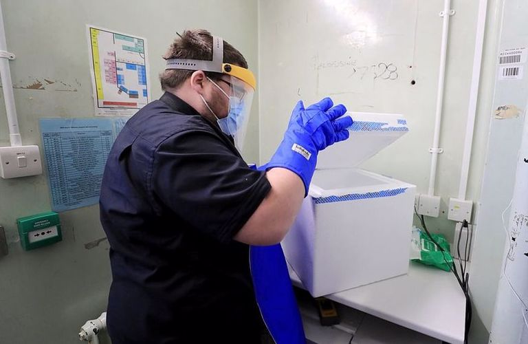 Όπως φαίνεται και στη φωτογραφία της Daily Mail οι ειδικοί ανοίγουν το κουτί με τα εμβόλια της Pfizer / BioNTech στο Πανεπιστημιακό Νοσοκομείο «Croydon» στο νότιο Λονδίνο για να τα αποθηκεύσουν στους -70 βαθμούς Κελσίου πριν αποψυχθούν για να χρησιμοποιηθούν.