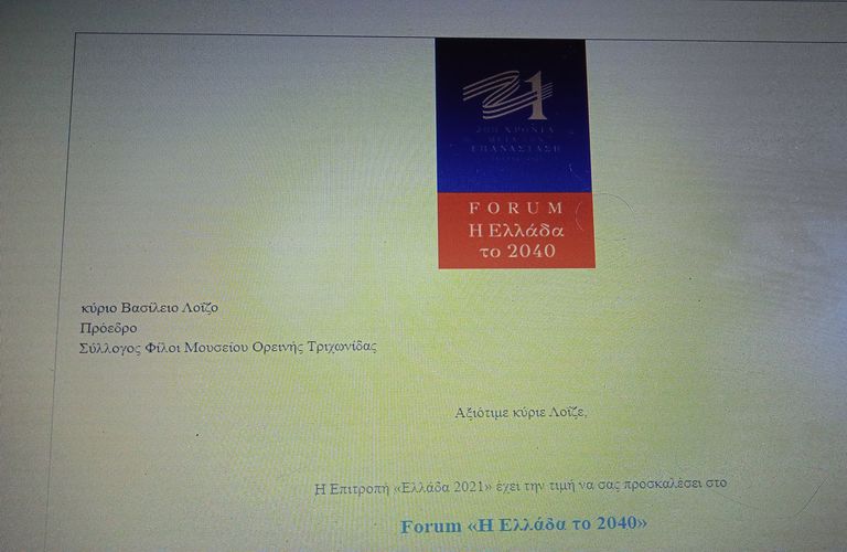 Μια ακόμη τιμητική πρόσκληση έλαβε ο Σύλλογος «ΟΙ ΦΙΛΟΙ ΤΟΥ ΜΟΥΣΕΙΟΥ ΟΡΕΙΝΗΣ ΤΡΙΧΩΝΙΔΑΣ» από την ΕΠΙΤΡΟΠΗ «ΕΛΛΑΔΑ 2021» για να συμμετάσχει στη τριήμερη εκδήλωση με την ονομασία FORUM «Η ΕΛΛΑΔΑ ΤΟ 2040» με την συμμετοχή κυβερνητικών και θεσμικών φορέων της χώρας καθώς εκπροσώπων παραγωγικών κλάδων και κοινωνικών εταίρων.