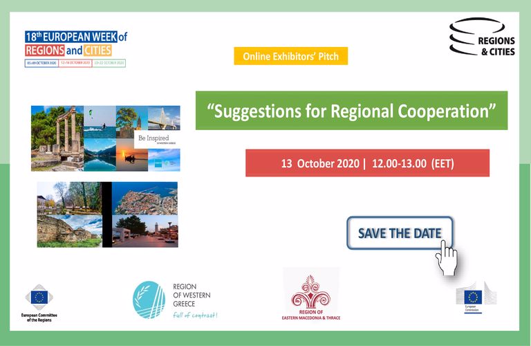 – 13 Οκτωβρίου 2020 ώρα 12.00-13.00, συμμετοχή σε Exhibitors’ pitch με τίτλο: “Suggestions for regional cooperation” με επικεφαλή εταίρο την Περιφέρεια Δυτικής Ελλάδας σε συνδιοργάνωση με την Περιφέρεια Ανατολικής Μακεδονίας και Θράκης.