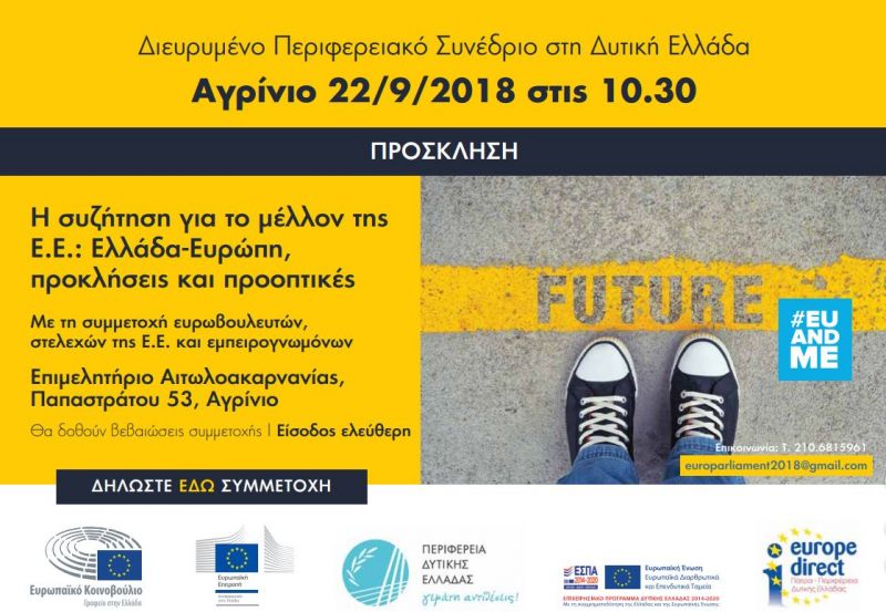 Το Γραφείο του Ευρωπαϊκού Κοινοβουλίου στην Ελλάδα και η Περιφέρεια Δυτικής Ελλάδας, με την υποστήριξη της Αντιπροσωπείας της Ευρωπαϊκής Επιτροπής στην Ελλάδα, της Ειδικής Υπηρεσίας Διαχείρισης Επιχειρησιακού Προγράμματος Περιφέρειας Δυτικής Ελλάδας, του Κέντρου Ευρωπαϊκής Πληροφόρησης “Europe Direct Patras” Περιφέρειας Δυτικής Ελλάδας και του Επιμελητηρίου Αιτωλοακαρνανίας διοργανώνουν Διευρυμένο Περιφερειακό Συνέδριο, με θέμα: «Η συζήτηση για το μέλλον της ΕΕ, Ελλάδα – Ευρώπη: προκλήσεις και προοπτικές».