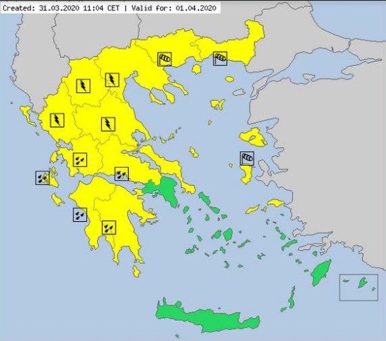 - α. Την Τετάρτη (01-04-2020) βροχές και καταιγίδες κατά τόπους ισχυρές θα εκδηλωθούν στο Ιόνιο, την Ήπειρο, τη δυτική Στερεά, τη βορειοδυτική Πελοπόννησο και σταδιακά στη Θεσσαλία και τις Σποράδες.