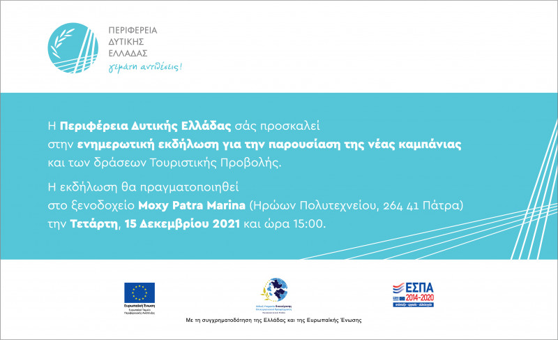 Η Περιφέρεια Δυτικής Ελλάδας διοργανώνει την Τετάρτη 15 Δεκεμβρίου 2021 εκδήλωση παρουσίασης της νέας τουριστικής ταυτότητας «Olympian Land» και της νέας καμπάνιας με τίτλο «EPIC WEST» καθώς και των δράσεων τουριστικής προβολής για την περίοδο 2021-2023.