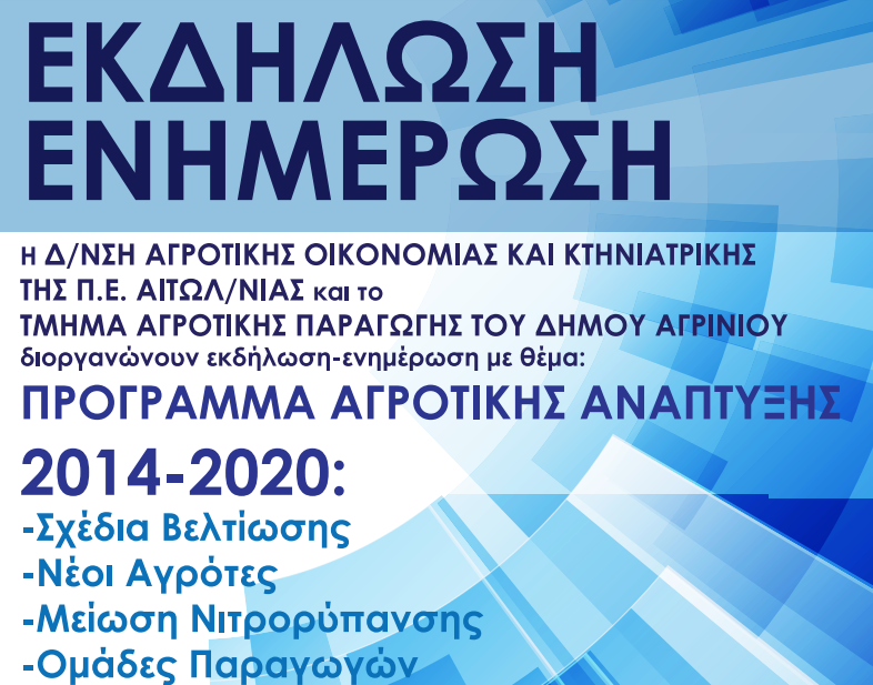 Π.Ε. Αιτ/νίας: Εκδήλωση-Ημερίδα με θέμα «Πρόγραμμα Αγροτικής Ανάπτυξης 2014-2020» στο Αγρίνιο