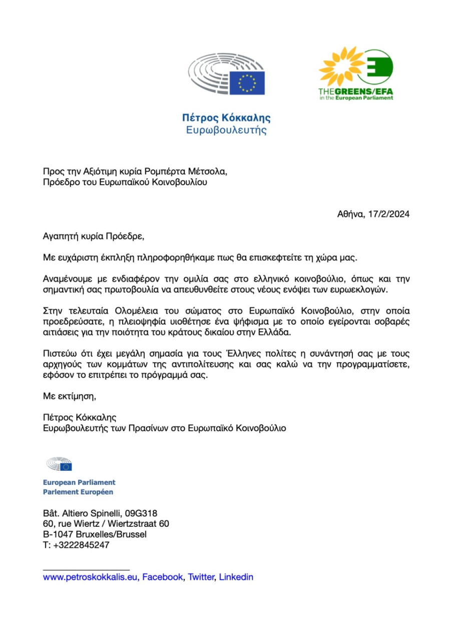 Με την ευκαιρία της καθόδου της κ. Μέτσολα στην Ελλάδα και την ομιλία που θα απευθύνει ενώπιον του ελληνικού κοινοβουλίου, ο Πέτρος Κόκκαλης, με επιστολή του, καλεί την Πρόεδρο του Ευρωπαϊκού Κοινοβουλίου να έχει συναντήσεις και με τους επικεφαλής της αντιπολίτευσης, προκειμένου να συζητηθούν οι ανησυχίες των κομμάτων μετά και την υιοθέτηση του ψηφίσματος του Ευρωκοινοβουλίου σχέτικά με την ποιότητα του κράτους δικαίου στην Ελλάδα.