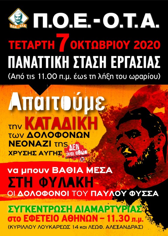 Η Πανελλήνια Ομοσπονδία Εργαζομένων Οργανισμών Τοπικής Αυτοδιοίκησης (Π.Ο.Ε.-Ο.Τ.Α.) καλεί τους εργαζόμενους στους Ο.Τ.Α. να συμμετάσχουν μαζικά στη Συγκέντρωση Διαμαρτυρίας που θα πραγματοποιηθεί έξω από το Εφετείο Αθηνών στις 11:30 το πρωί της ΤΕΤΑΡΤΗΣ 7 ΟΚΤΩΒΡΙΟΥ 2020, προκειμένου να στείλουν ηχηρό μήνυμα, το οποίο θα ακουστεί απ’ άκρη σ’ άκρη της Ελλάδας, πώς η βία, ο φασισμός και τα εγκλήματα της Χρυσής Αυγής πρέπει να τιμωρηθούν παραδειγματικά.