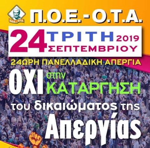 Π.Ο.Ε.-Ο.Τ.Α.: Τρίτη 24 Σεπτεμβρίου 2019 – 24ωρη Πανελλαδική Απεργία