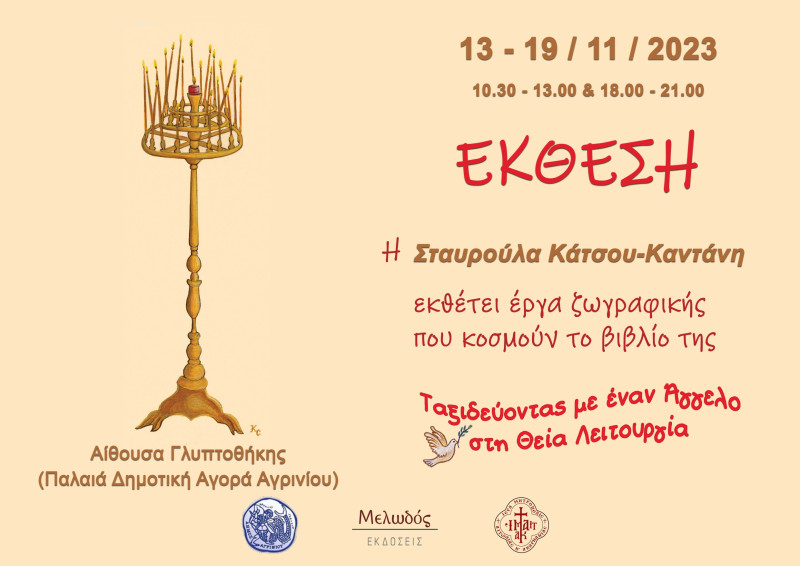 Η κ. Σταυρούλα Κάτσου -Καντάνη, θεολόγος – συγγραφέας, εκθέτει έργα ζωγραφικής που κοσμούν το βιβλίο της «Ταξιδεύοντας με έναν Άγγελο στη Θεία Λειτουργία», Εκδόσεις ΜΕΛΩΔΟΣ, από 13-11-2023 έως και 19-11-2023, στην Αίθουσα Γλυπτοθήκης (Παλαιά Δημοτική Αγορά Αγρινίου).