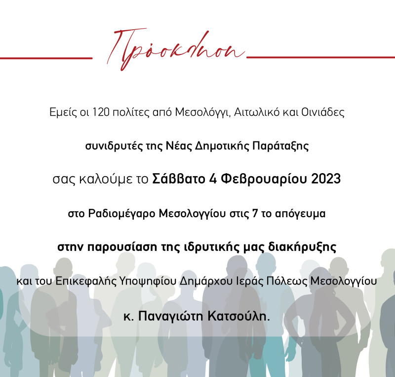 Η παρουσίαση της ιδρυτικής διακήρυξης της νέας Δημοτικής παράταξης, θα γίνει το Σάββατο 4 Φεβρουαρίου 2023 και ώρα 19.00, στο Ραδιομέγαρο Μεσολογγίου.