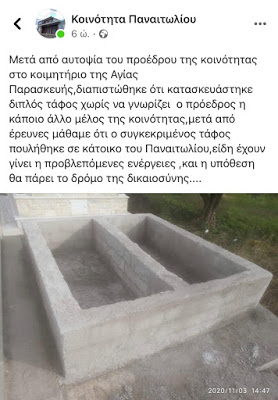 πολίτη που κατόπιν από έρευνα από τον πρόεδρο της Κοινότητας Παναιτωλίου, όχι μόνο είχε κατασκευάσει χωρίς άδεια στο κοιμητήριο του Ιερού Ναού Αγίας Παρασκευής Παναιτωλίου αυθαίρετο διπλό τάφο αλλά στην συνέχεια τον πούλησε σε κάτοικο του χωριού.