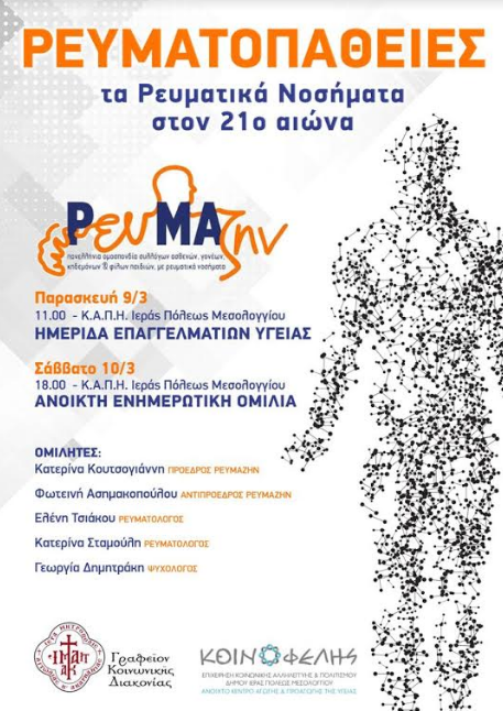 - Το Σάββατο 10 Μαρτίου στις 18.00 στο Κ.Α.Π.Η. Ιεράς Πόλεως Μεσολογγίου, Ανοικτή Ενημερωτική Ομιλία με θέμα τα ρευματικά νοσήματα, τη θεραπεία τους, τους τρόπους αντιμετώπισης των συνεπειών τους και την εκπαίδευση σε αυτούς τους τρόπους, τα επιδόματα και τις παροχές που δικαιούνται οι ρευματοπαθείς, την πιστοποίηση κάθε σχετικής αναπηρίας και τη συνεργασία όλων των εμπλεκομένων με τις ρευματοπάθειες προς όφελος των ασθενών. Η συμμετοχή είναι ελεύθερη για κάθε ενδιαφερόμενο.