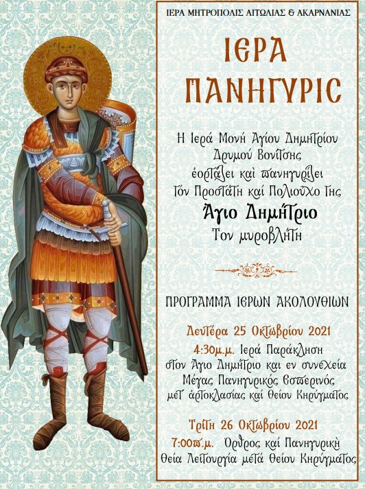 Την Τρίτη, 26 Οκτωβρίου 2021 στις 07:00 η Ιερά Μονή Αγίου Δημητρίου Δρυμού Βονίτσης εορτάζει και πανηγυρίζει τον Προστάτη και Πολιούχο της Άγιο Δημήτριο τον Μυροβλήτη.