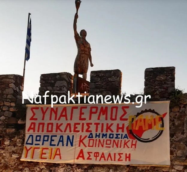 Απεργιακές κινητοποιήσεις σήμερα με το ΠΑ.ΜΕ. νωρίς το πρώί να έχει τοποθετήσει ένα μεγάλο πανό διαμαρτυρίας στο Λιμάνι της Ναυπάκτου το οποίο αναγράφει:”Συναγερμός Αποκλειστική Δωρεάν υγεία – δημόσια κοινωνική ασφάλιση”.