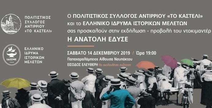 Το Ελληνικό Ίδρυμα Ιστορικών Μελετών (ΙΔΙΣΜΕ) σε συνεργασία με τον Πολιτιστικό Σύλλογο Αντιρρίου «το Καστέλι» παρουσιάζει το Σάββατο 14 Δεκεμβρίου 2019 και ώρα 19:00 στην Παπαχαραλάμπειο Αίθουσα Ναυπάκτου (Μεσολογγίου 40, Ναύπακτος) το ιστορικό ντοκιμαντέρ «Η Ανατολή Έδυσε», σε σκηνοθεσία Αλέξανδρου Παπαηλιού και ιστορική επιμέλεια Ειρήνης Σαρίογλου.