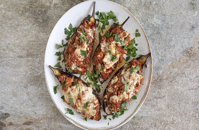 Μοιράζουμε τη γέμιση σε όλες τις μελιτζάνες, πασπαλίζουμε με το τυρί και ψήνουμε για 10 λεπτά για να πάρουν χρώμα.