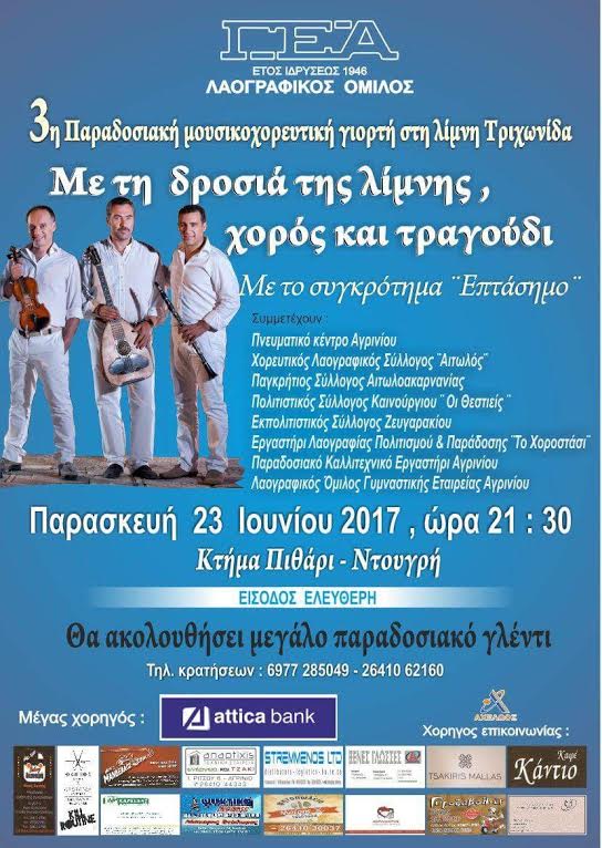 Με την δροσιά της λίμνης – χορός και τραγούδι, είναι ο τίτλος της Παραδοσιακής μουσικοχορευτικής γιορτής που διοργανώνεται για τρίτη συνεχή χρονιά από τον Λαογραφικό Όμιλο της Γυμναστικής Εταιρείας Αγρινίου (ΓΕΑ), στη λίμνη Τριχωνίδα.