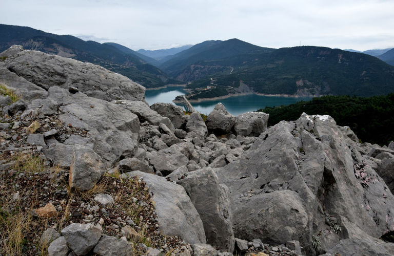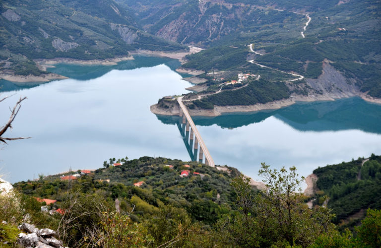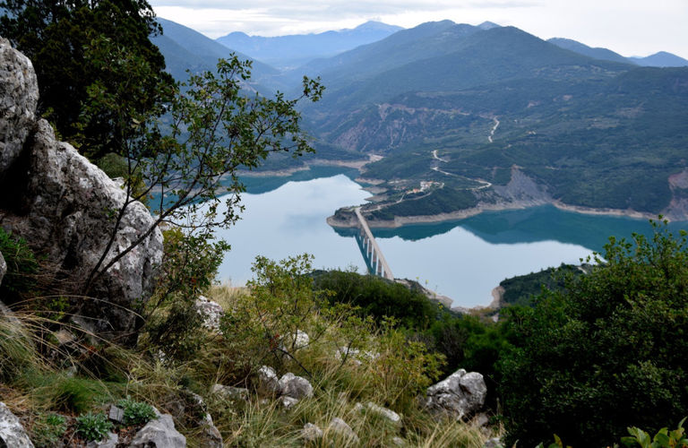 Η θέα είναι καταπληκτική προς ένα τμήμα της λίμνης την Κρεμαστών και τη Γέφυρα της Επισκοπής.