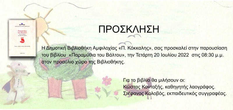 Η Δημοτική Βιβλιοθήκη Αμφιλοχίας «Παναγιώτης Κόκκαλης» σας προσκαλεί στην παρουσίαση του βιβλίου «Παραμύθια του Βάλτου», την Τετάρτη 20 Ιουλίου 2022 στις 20:30, στον προαύλιο χώρο της Βιβλιοθήκης.