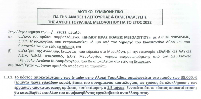 Από το σχετικό άρθρο του ιδιωτικού συμφωνητικού για την ανάθεση λειτουργίας και εκμετάλλευσης της Αλυκής Τουρλίδας Μεσολογγίου για το έτος 2022