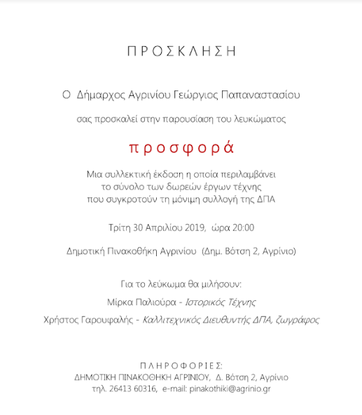 Την Τρίτη 30 Απριλίου στις 20.00 θα γίνει η παρουσίαση του λευκώματος «προσφορά» στην αίθουσα της Δημοτικής Πινακοθήκης Αγρινίου.