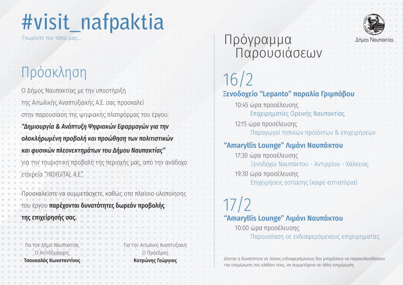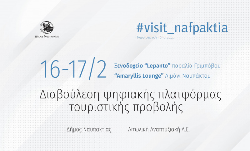 Ο Δήμος Ναυπακτίας με την υποστήριξη της Αιτωλικής Αναπτυξιακής Α.Ε. Ο.Τ.Α. πραγματοποιεί την Τετάρτη 16 και την Πέμπτη 17 Φεβρουαρίου 2022 σειρά παρουσιάσεων της ψηφιακής πλατφόρμας του έργου: «Δημιουργία και Ανάπτυξη Ψηφιακών Εφαρμογών για την ολοκληρωμένη προβολή και προώθηση των πολιτιστικών και φυσικών πλεονεκτημάτων του Δήμου Ναυπακτίας» που αφορά στην τουριστική προβολή της Ναυπακτίας.