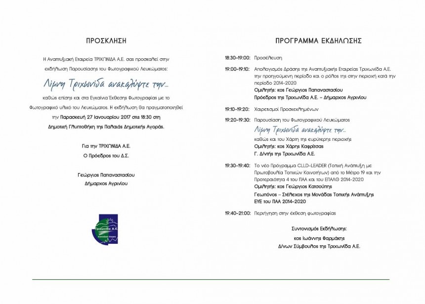 Slider Παρουσιάζεται εκπληκτικό λεύκωμα για τη λίμνη Τριχωνίδα 20 Ιαν 2017 AgrinioTimes Share Tweet ☆ Ακολουθήστε μας στο Google News Σχετικά θέματα:Προτεινόμενα Advertisement Τελευταία νέα →19 Οκτ 2025 12:56Ημερήσιες Προβλέψεις για τα Ζώδια (19/10)19 Οκτ 2025 12:31Εορτολόγιο: 19 Οκτωβρίου τιμάται από την Εκκλησία ο Προφήτης Ιωήλ19 Οκτ 2025 12:26Γεγονότα που σημειώθηκαν σαν σήμερα (19/10)19 Οκτ 2025 01:44Ο Καιρός (19/10): Ασθενής βροχόπτωση και συννεφιά στο Αγρίνιο, έως 20 βαθμούς Κελσίου η θερμοκρασία19 Οκτ 2025 01:34SL1 – Μπένι Ενκολόλο: «Συνεχίστε να έρχεστε στο Γήπεδο γιατί σας χρειαζόμαστε»19 Οκτ 2025 00:20SL1 – Γιάννης Αναστασίου: «Με υπομονή, πίστη και πειθαρχία δικαιωθήκαμε»18 Οκτ 2025 23:57SL1 – Μίλαν Ράσταβατς: «Δεν καταφέραμε να είμαστε ήρεμοι, πολλά λάθη σε μικρό διάστημα»18 Οκτ 2025 23:32SL1 – 7η Αγωνιστική: Παναιτωλική… ΑΝΑΣΤΑΣΗ για πρώτη φορά (στη σεζόν) στο Γήπεδο της Προυσιωτίσσης!18 Οκτ 2025 18:27Super League – Παναιτωλικός: Νίκησε η Κ17, έχασε η Κ15 και την Κυριακή (19/10) παίζει η Κ1918 Οκτ 2025 18:21«Τρομεροί Γονείς»: Η οικογενειακή ζωή στο… φόρτε της! – Περιλήψεις επεισοδίων (18-19/10)
